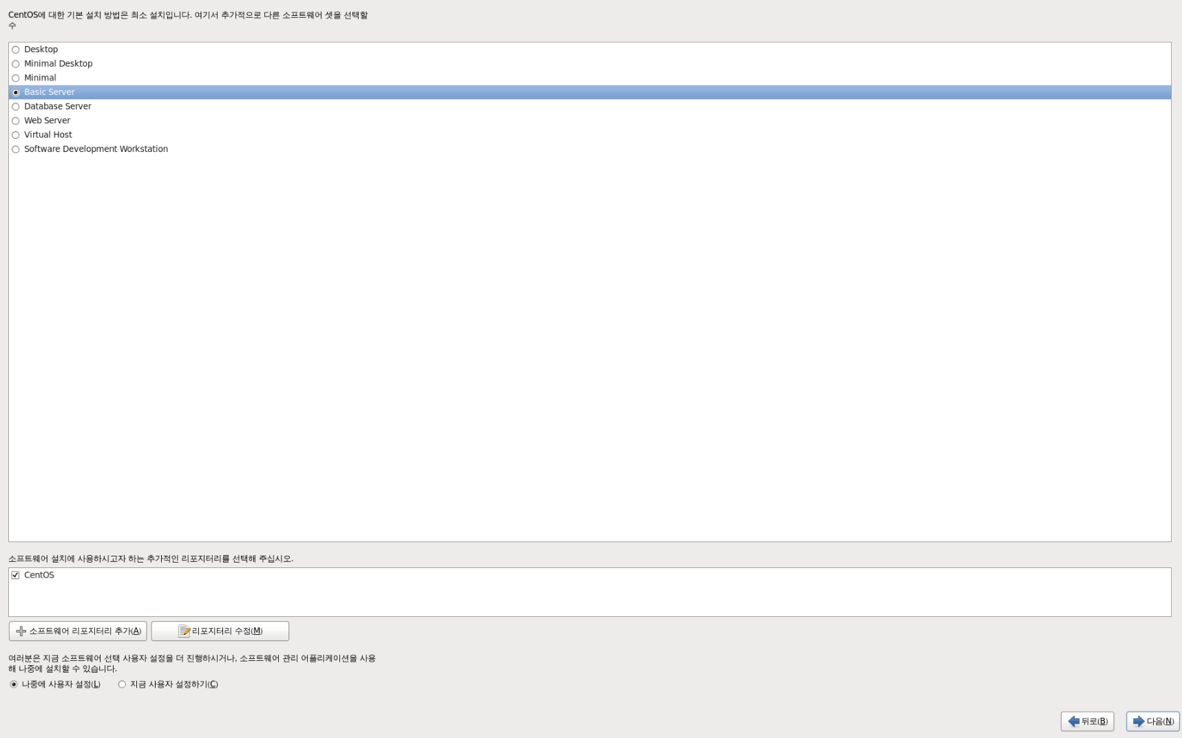 작지만 CentOS 용도에 따라 어떤 옵션으로 설치할지 질문. 서버용으로 만들어볼거라 Basic Server로 설치