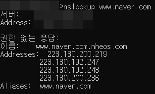 Windows에서는 nslookup으로 도메인네임을 검색하면