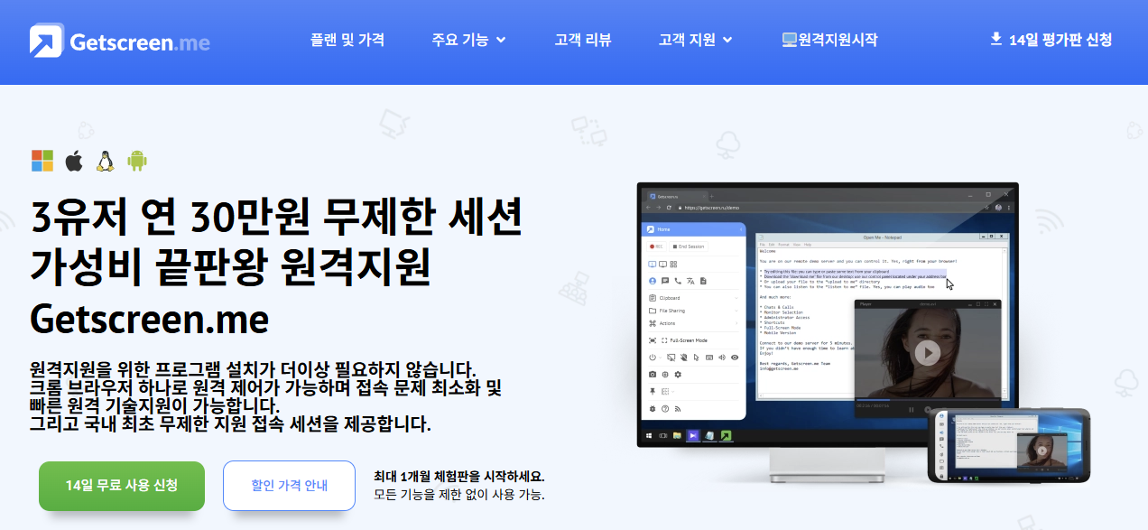 겟스크린미 | 설치 없는 1:1 원격지원 + 무인 원격제어, 3유저 30만원