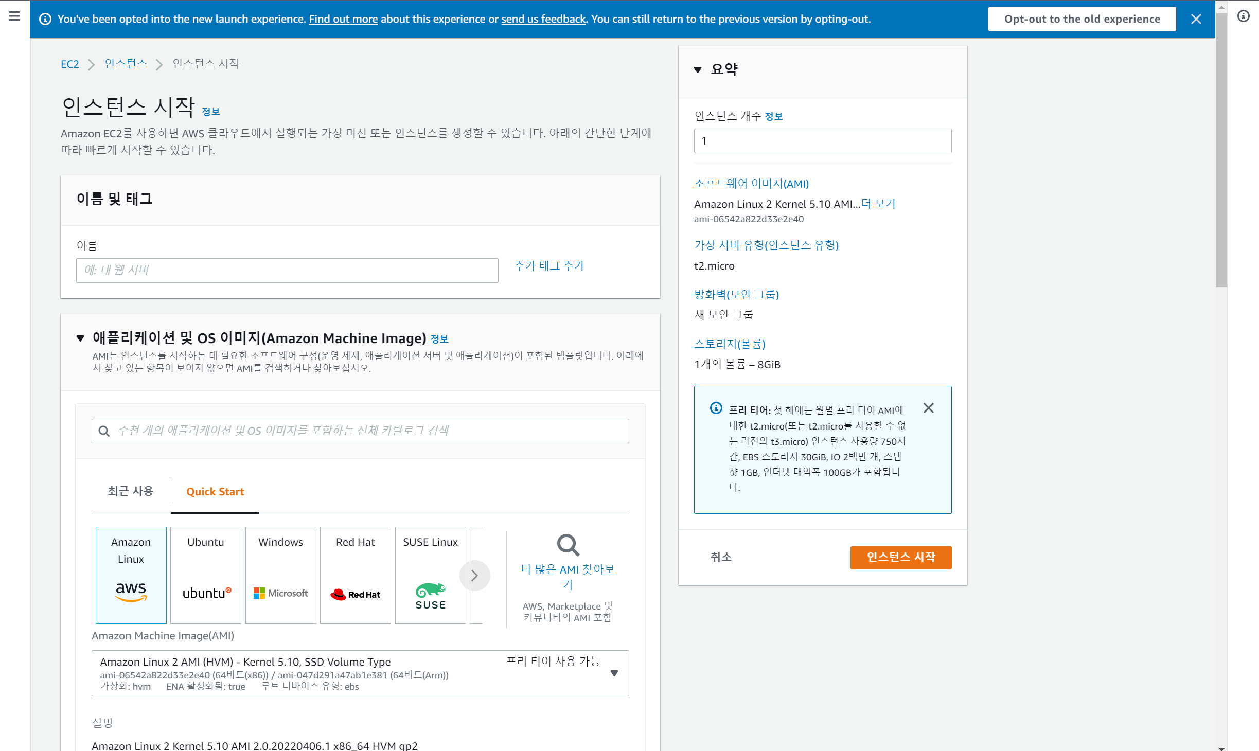 아마존 리눅스 AWS 이미지를 사용하도록 하겠습니다.